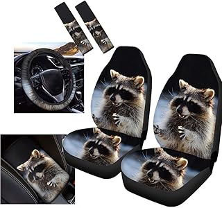 Showudesigns 6-teiliges Autozubehör-Set Waschbär-Druck, inkl. 2 Autositzbezüge-Set mit 2 Gurtpolstern & 1 Lenkrad & 1 Armlehnenbezug, passend für Fahrzeug Limousine u.